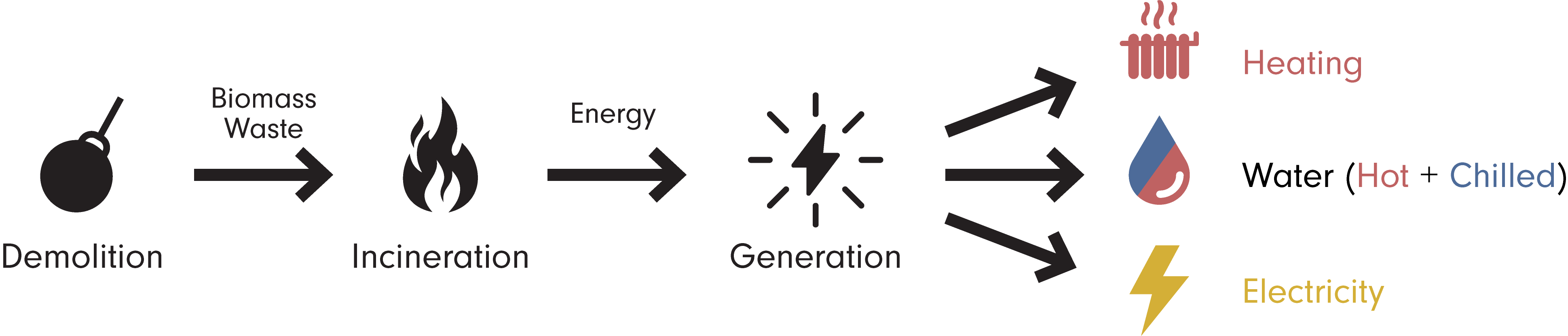 Wastes will be shredded off site and transport to be incinerated in the building. Hot steam created through burning pumps into the turbine and drives it to generate electric power. The residual heat of the incineration is used to heat up the heating fluid that runs through fan coils deployed across the building. The ventilation system humidifies fresh air and sends it into the vents. The air gets warmed up when flowing through the coils before it enters each room. The cooling machine powered by the energy generated from the power plant chills the cooling fluid, which then runs through the fan coil system to cool down supply air and indoor temperature.